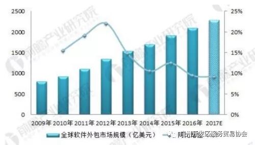 图表2:2009-2017年全球软件外包行业市场规模及增速(单位:亿美元,%)