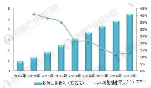 图表3:2009-2017年国内软件业务收入规模及增速(单位:万亿元,%)